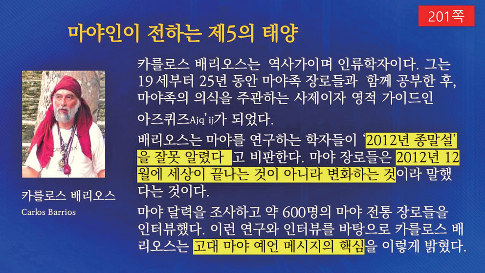 역사가이며 인류학자인 카를로스 베리오스Carlos Barrios는 “마야족의 장로들은 2012년 12월에 세상이 끝나는 것이 아니라 변화하는 것이라고 말했다.”라고 밝혔습니다. 또한 그는 마야 달력을 조사하고 여러 마야 장로들과 인터뷰해서 고대 마야 예언 메시지의 핵심 내용을 이렇게 밝혔습니다.