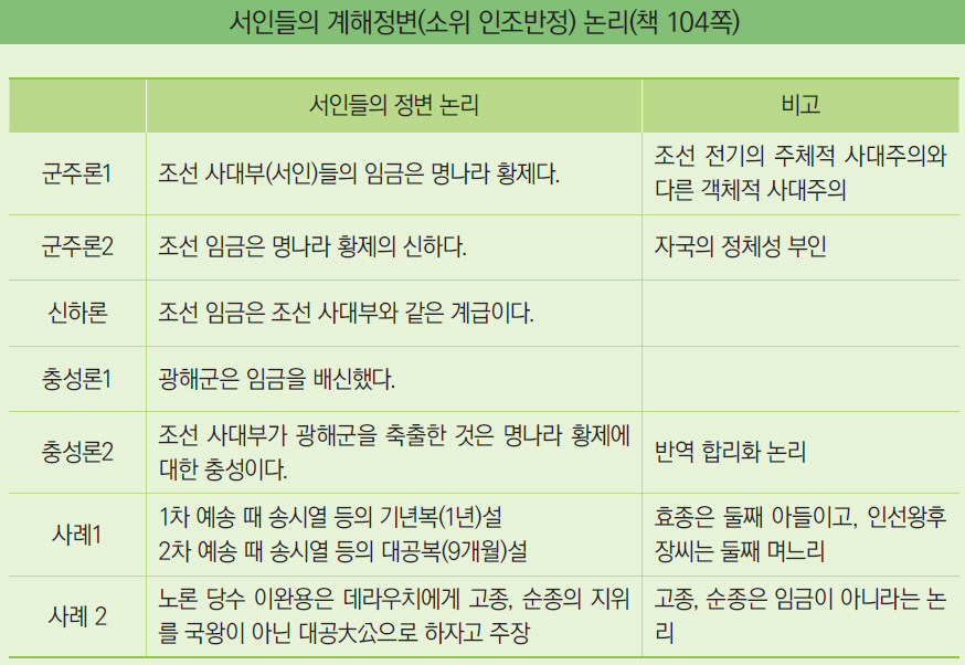 노론 사관은 처음 듣는 이들도 많을 것 같은데 이 책에서는 그 전에 우리가 알고 있는 ‘인조반정’仁祖反正을 ‘1623년 계해정변癸亥政變’이라고 규정하고 있다. 이 정변을 일으킨 서인西人, 그중 노론老論 당파가 조선 후기를 지배하였고, 이들의 지배 논리를 노론 사관이라고 한 것이다. 여전히 그들이 대한민국을 지배하고 있다.