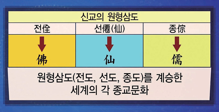 신교의 원형 삼도三道는 전도佺道, 선도仙道, 종도倧道이며, 이는 『환단고기桓檀古記』에도 기록되어 있습니다. 이것이 각각 불佛⋅선仙⋅유儒가 되었으니, 신교에서 유불선이 나왔습니다. 또한 유불선은 합일되어 제3의 초종교인 증산도甑山道로 귀결되는 과정입니다.