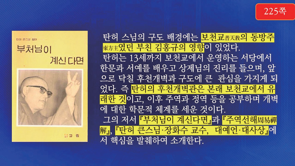 그 영향이 아주 지대하게 클 수밖에 없는데, 탄허 스님이 여러 승려 가운데서도 특별히 예언을 많이 하신 배경에는, 탄허의 후천개벽관이 본래 보천교에서 유래한 것이기 때문입니다. 이후 주역과 정역을 공부하시고 수행하시어 개벽에 대한 학문적 체계를 세우셨습니다.