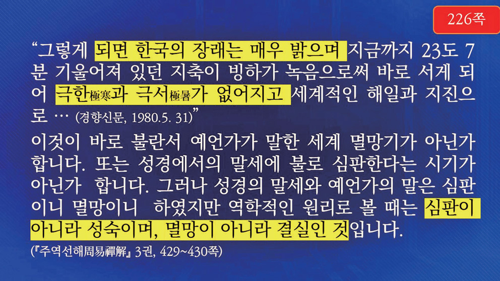 “그렇게 되면 한국의 미래는 매우 밝으며 지금까지 23도 7분 기울어져 있던 지축이 빙하가 녹음으로써 바로 서게 되어 극한極寒과 극서極暑가 없어지고 세계적인 해일과 지진으로 …… (서양에서는) 이를 불의 심판이니 멸망이니 하였지만 역학적인 원리로 볼 때는 심판이 아니라 성숙이며, 멸망이 아니라 결실인 것입니다.”
