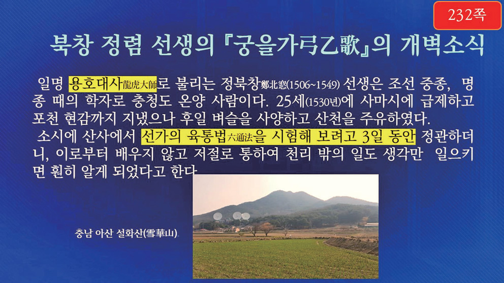 용호대사龍虎大師로 불리는 정북창鄭北窓 선생은 조선 중종~명종 때의 학자로 온양 출신입니다. 벼슬을 했으나 나중에 그만두고 충남 아산의 설화산에서 선가의 도통법인 육통법六通法을 시험해 보려고 3일 동안 정관하였더니, 이로부터 배우지 않고도 천 리 밖의 일을 생각만으로 알게 되었다고 합니다. 도전 2편 34장에는 “정북창鄭北窓 같은 재주로도 ‘입산 3일에 시지천하사始知天下事’라 하였느니라.”라는 말씀이 있습니다.