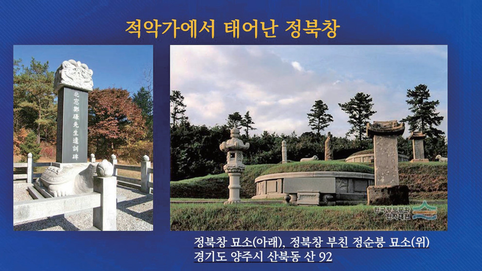 정북창은 이러한 아버지와 형의 행적 때문에 경기도 주변을 전전하며 벼슬도 하지 않고 숨어 살았습니다. 그는 북쪽으로 창을 내어 서울을 쳐다보지 않겠다는 의미로 '정북창'이라는 이름을 갖게 되었습니다. 정북창과 그의 아버지의 묘소가 위아래로 나란히 있습니다.