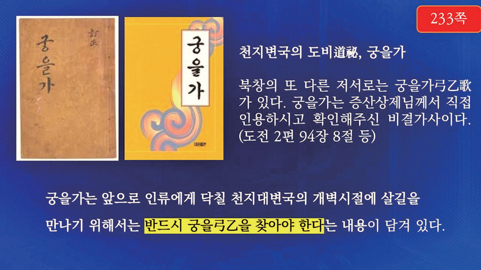 정북창이 저술한 『궁을가弓乙歌』라는 책이 있습니다. 이 책은 상제님께서도 도전 2편 94장을 비롯한 여러 곳에서 인용하시고 확인해 주신 비결서입니다. 이 책에는 앞으로 인류에게 닥칠 대변국을 극복하고 살길을 찾기 위해서는 반드시 궁을弓乙을 찾아야 한다는 내용이 담겨 있습니다.