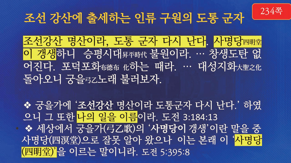 상제님께서는 궁을가의 ‘조선 강산 명산이라 도통군자 다시 난다.’라는 구절이 나를 두고 한 말이라고 하셨습니다. 이는 인류를 구원하는 도통 군자, 즉 상제님께서 이 땅에 오신다는 의미입니다. ‘사명당이 갱생한다.’는 것은 중 사명당四溟堂이 아니라 천지의 부모산과 네 개의 명당(四明堂)을 뜻한다고 정북창 선생이 얘기하고 있습니다.