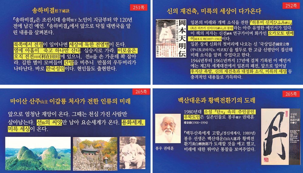 개벽 책 상권 214쪽 맨 밑을 보시면 “한국의 예지자들이 들려주는 한국과 세계에 대한 예언은 서양이나 그 밖의 성자들이 전하는 미래의 소식과는 달리, 한 구절 한 구절에 대단히 함축적인 의미를 담고 있으며, 대변국이 발생할 수밖에 없는 필연적인 이유를 우주 원리를 바탕으로 하여 밝히고 있다.”라고 나와 있습니다. 이제 한국의 예지자들이 밝힌 예언을 자세히 살펴보겠습니다.