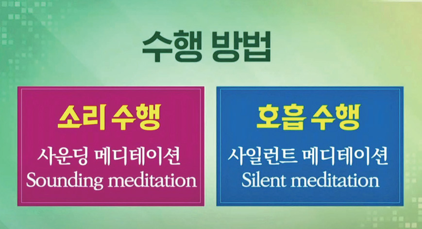 현대 생물학이나 소리공학에서, 우리 인간 생체의 세포가 소리의 공명기共鳴器라고 합니다. 그러니까 우리 온몸의 세포가 가장 즉각적으로 반응하는 게 소리라는 거죠. 수행 방법에는 크게 소리를 내서 하는 사운딩 메디테이션Sounding meditation과, 소리를 내지 않고 하는 사일런트 메디테이션Silent meditation이 있습니다.
