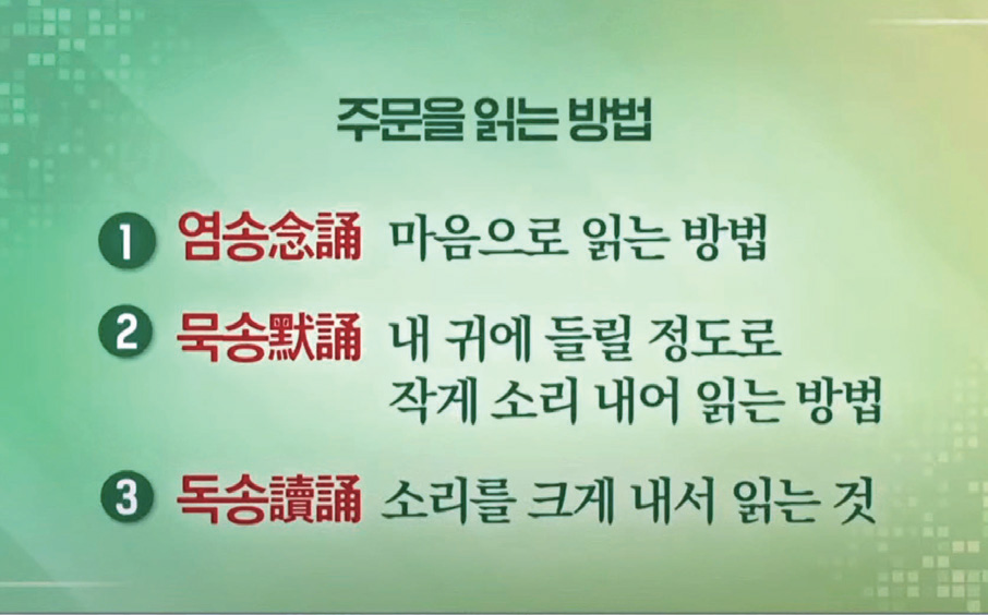 그 다음, 묵송黙誦이 있습니다. 묵송은 내 귀에 들릴 정도로 작게 소리 내어 읽는 것입니다. 큰 소리를 내면 수행을 오래 지속할 수가 없습니다. 기력이 소모되기 때문이죠. 또 배가 고파져서 계속 읽기 어렵습니다. 큰 소리로 세 시간 이상 주문 수행을 해 보십시오. 젊은 사람들 가운데 도장이 떠나가도록 소리 내어 읽는 사람이 있습니다. 하지만 그렇게 하면 소리를 오래 낼 수가 없습니다. 지칩니다. 그땐 묵송으로 들어가야 합니다.