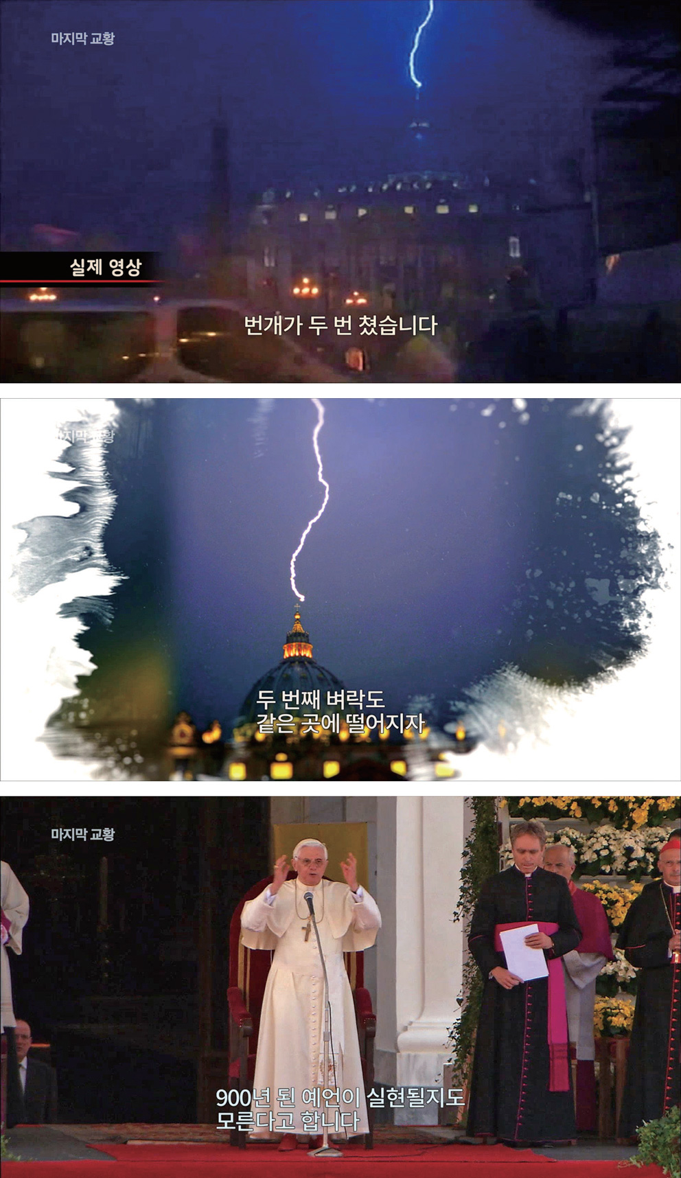 교황이 사임을 발표하고 불과 몇 시간이 지나자 하늘이 갈라지면서 벼락이 성 베드로 대성당의 둥근 지붕을 맹렬히 내리쳤다. 두 번째 벼락도 같은 곳에 떨어지자 구경하던 사람들은 할 말을 잃었다. 예언과 성경을 연구하는 사람들은 이것이 모두 말라키와 파티마의 메시지에서 예언된 하느님의 계시라고 말했다.
