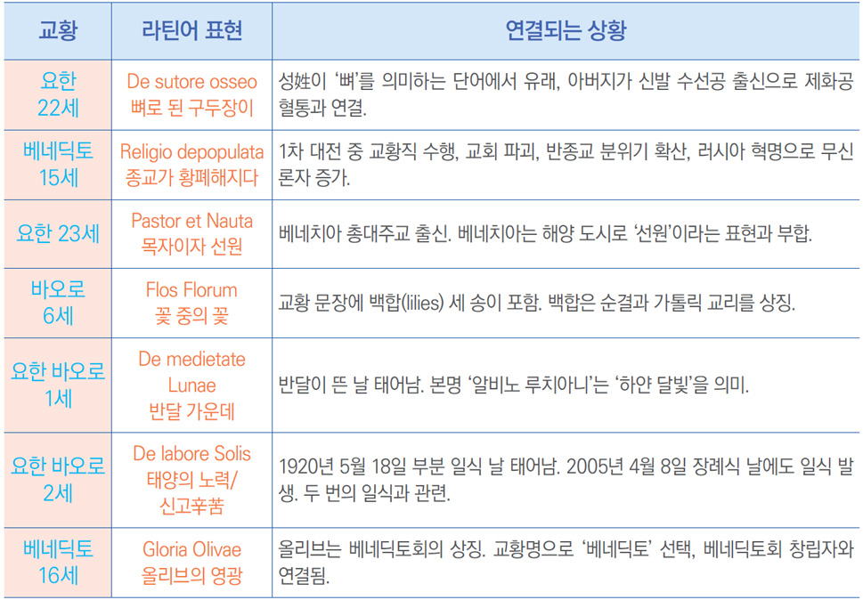 요한 바오로 1세는 반달이 떴을 때 태어났다. 원래 이름은 알비노 루치아니로 ‘하얀 달빛’이라는 의미를 담고 있다. 다음 교황인 요한 바오로 2세Ioannes Paulus PP. II는 라틴어로 ‘De labore Solis’, 즉 태양의 노력, 태양의 신고辛苦로 해석할 수 있는 어구가 붙었다. 1920년 5월 18일에 태어났는데, 이날은 부분 일식日蝕이 있었던 날이었으며, 그의 장례식 날(2005년 4월 8일)에도 태양이 가려지는 일식이 있었다. 해설자는 일식은 보기 드문 현상인데 두 번의 일식이 한 사람과 관련된 건 정말 희한한 일이라고 했다.