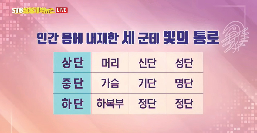 A 네, 안녕하세요. 우리 몸에는 세 가지 빛의 통로가 있는데요. 그것을 상단上丹, 중단中丹, 하단下丹이라고 합니다. 이에 대한 종도사님 말씀을 듣고 정리하는 시간을 갖겠습니다.