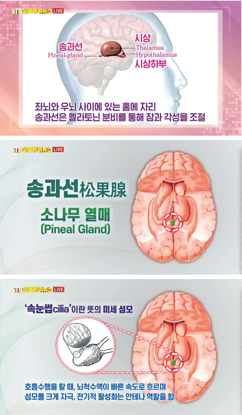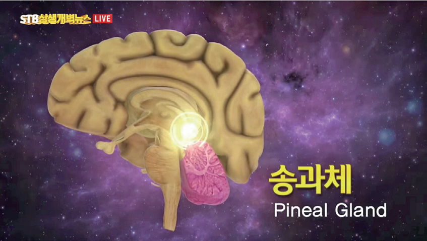 A 네~ 송과선松果腺 또는 송과체松果體(Pineal Body; Pineal Gland)는 좌뇌와 우뇌 사이에 있는 홈에 자리하고 있고, 솔방울 모양을 한 쌀 한 톨 크기의 내분비선입니다. 송과선은 멜라토닌 분비를 통해 잠과 각성을 조절하죠.