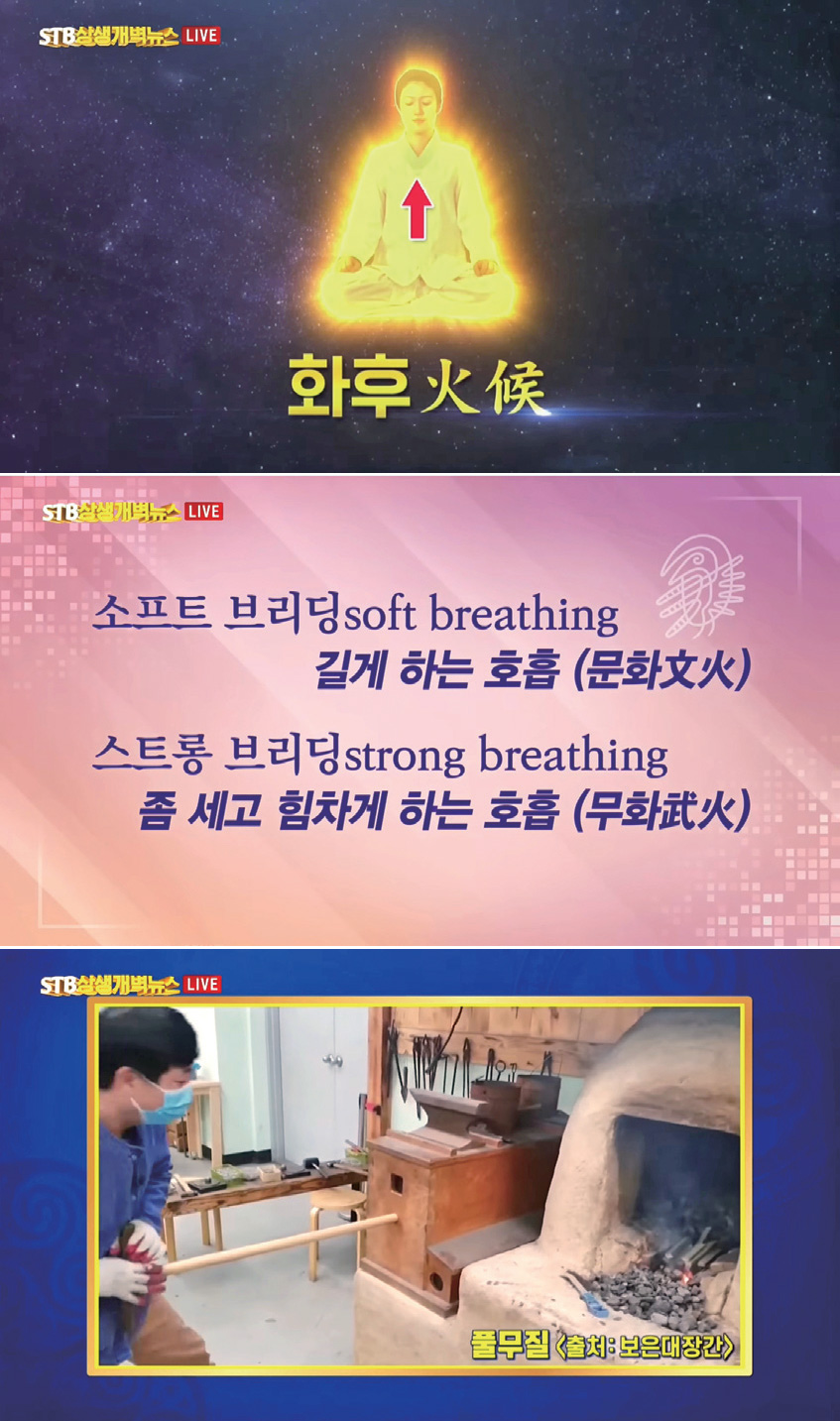 A 네~ 호흡법에는 두 종류가 있는데요. 부드럽고 자연스럽게, 길게 하는 호흡을 소프트 브리딩soft breathing이라 하고, 좀 세고 힘차게 하는 호흡을 스트롱 브리딩strong breathing이라 말합니다. 도교 계열에서는 쇠를 만들 때 풀무질하는 것처럼, 하단 호흡을 하면서 불을 붙여 준다는 의미에서 ‘화후火候’라는 표현을 쓰는데, 부드러운 호흡을 ‘문화文火’라 하고 강한 호흡을 ‘무화武火’라 합니다.