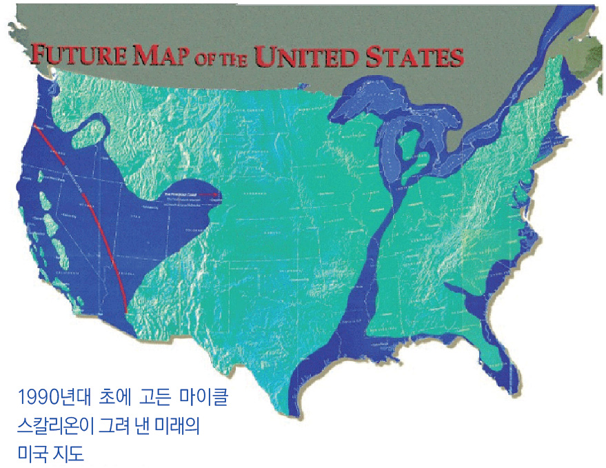 미국의 예언가 고든 마이클 스칼리온Gordon-Michael Scallion은 미국이 두 조각으로 나눠질 것이라며 저런 개벽 지도를 그렸습니다. 미국의 왼쪽은 샌프란시스코가 없어져서 바다가 된다는 것입니다. 또 과학적 근거를 바탕으로 만든 〈미국 침몰〉이라는 3부작 드라마를 보면 샌프란시스코, LA 지역에서 거대한 지진판이 강도 높게 뭉쳐서 언제 터질지 모른다는 거예요. 『둠스데이Doomsday 1999』(1982)를 썼고 20여 개 언어를 자유자재로 구사했다는 찰스 버리츠Charles Berlitz도 유럽에 홍수가 나서 지도가 바뀔 것을 예고한 적이 있습니다.
