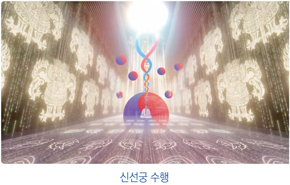 자, 눈을 감고 상념을 끊고 다 함께 쑥, 그 궁전의 성전에 들어왔어요. 성전 바닥에는 나의 모든 유전자를 치유하고 강화하는 언청계용신言聽計用神이 있습니다. 이 언청계용신은 어떤 문화권에도 안 나옵니다. 여기밖에 없는 거예요.