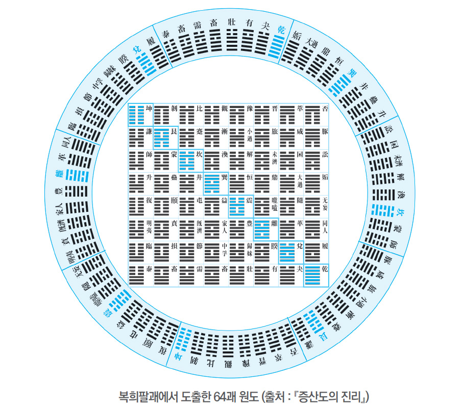 그 가운데 핵심 인물은 ‘태호 복희太皞伏羲(팔괘八卦를 그음)-문왕文王(64괘 괘사卦辭를 지음)-주공周公(384 효사爻辭를 지음)-공자孔子(십익十翼을 지음)-김일부金一夫(정역正易을 지음)’ 이렇게 다섯 성인인데, 모두 동방 동이족의 혈통을 타고 태어난 인물이다. 역 철학은 약 6천 년 동안 동방의 지혜 안에서 성립된 것이다.