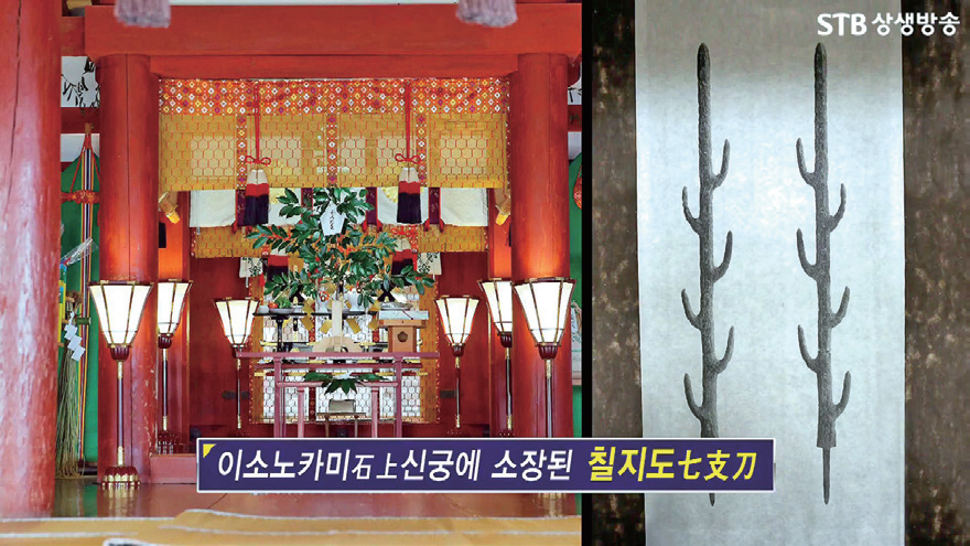 일본 나라奈良현 텐리天里시 이소노가미 신궁石上神宮에는 백제 왕(18세 전지왕腆支王)이 왜국의 진구神功 왕후에게 하사한 칠지도七支刀가 봉안되어 있다. 일제 식민사학자들은 이소노가미 신궁의 칠지도를 『일본서기』 진구神功 52년(252) 9월 조 기사에 나오는 칠지도七支刀와 같은 것으로 조작하여, 이 칠지도는 백제 왕이 ‘천황’에게 헌상獻上한 것이니 백제가 왜의 속국이고, 일본이 임나일본부를 설치하여 백제 등 한반도 남부를 지배⦁경영했다는 것이 움직일 수 없는 사실이라고 억지를 썼다.