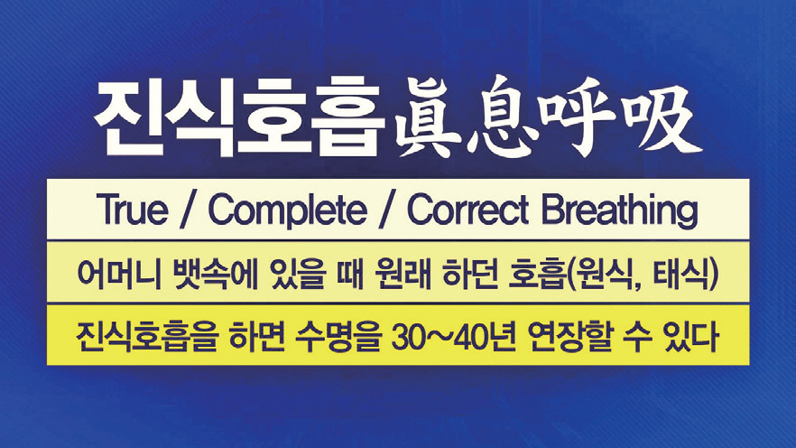 우리가 코로 하는 호흡만 계속하면 백 살도 못 삽니다. 원래는 하단전으로 호흡을 해야 되는 것입니다. 이것을 내호흡內呼吸이라 합니다. 가슴으로 쌕쌕거리며 하는 것은 외호흡外呼吸, 범식凡息입니다. 인간은 원래 진식眞息, 참된 호흡을 해야 합니다. 우주의 빛과 하나 되는 호흡을 해야 하는 것입니다. 우주의 두 빛의 주문 시천주주와 태을주를 읽어 하단전으로 호흡하면, 빛의 인간으로 살 수 있는 문턱을 넘는 것입니다. - 2024년 10월 9일, 서울 스위스그랜드호텔 종도사님 말씀