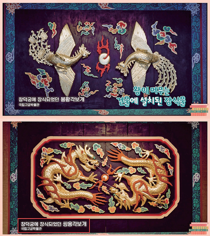 조선 시대의 궁궐, 경복궁景福宮의 근정전勤政殿에는 임금이 정치를 하던 정전正殿이 있습니다. 정전으로 올라가는 계단에는 사람이 걸어 오를 수 없는 계단 영역이 있습니다. 이를 두고 ‘답도踏道’라고 합니다. 답도란 오직 임금만이 가마를 타고 그 위를 지나갈 수 있게끔 만들어진 구조물입니다. 답도에는 상징적인 그림이 새겨져 있습니다. 경복궁의 근정전, 창덕궁昌德宮의 인정전仁政殿 답도를 보면 봉황鳳凰 두 마리가 서로 마주 보고 있습니다. 그리고 답도 한가운데에는 여의주如意珠가 자리하고 있습니다. 창덕궁에 장식되었던 〈봉황각보개鳳凰刻寶蓋〉의 사진을 볼까요?
