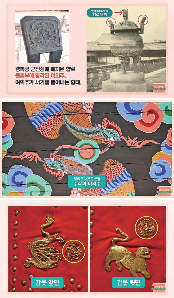 경복궁을 방문할 때면 항상 지나가게 되는 광화문光化門에도 여의주가 그려져 있습니다. 또한 광화문 어간문御間門 천장에 복원된 그림에 주작朱雀과 여의주가 있고, 광화문 협문夾門 천장에 복원된 기린도麒麟圖에도 여의주가 장식되어 있습니다.