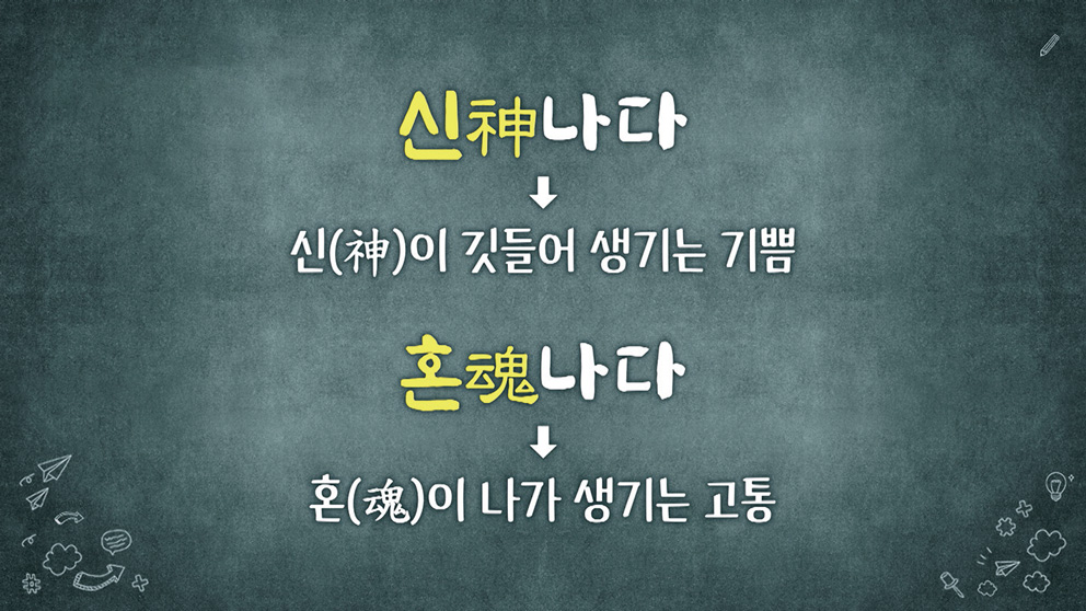 흥미로운 점은, 지난 시간에 다루었던 ‘신나다’와 오늘의 ‘혼나다’가 모두 조상들의 영적 세계관에서 비롯되었음에도 정반대의 경험을 가리킨다는 사실입니다. ‘신나다’는 신이 몸에 들어와 생기는 기쁨을, ‘혼나다’는 혼이 빠져나가 생기는 고통을 표현합니다. 재미있는 건 둘 다 평상시와는 다른 특별한 상태를 나타낸다는 점입니다. 신이 나도 일상의 평범함을 벗어난 상태이고, 혼이 나도 속사람과 겉사람의 정상적인 결합에서 벗어난 상태를 말하니까요.