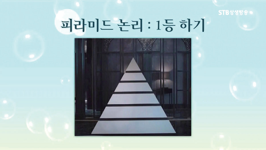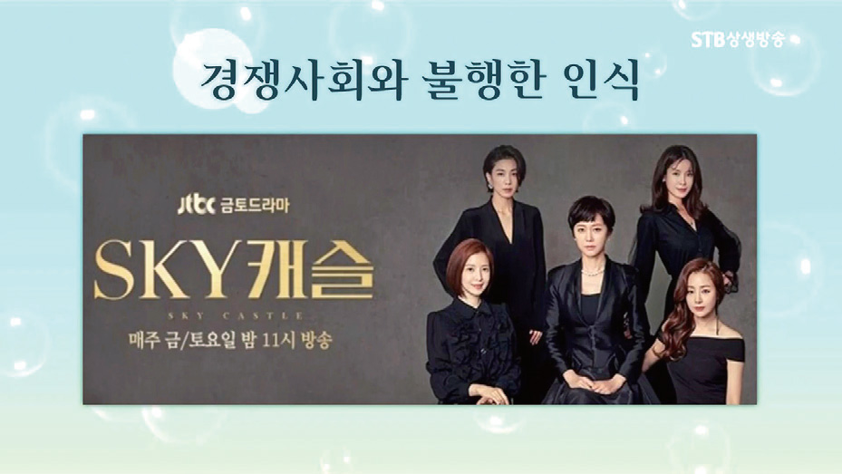 그 결과 #행복을 느껴야 할 현재를 잃어버리고, 항상 미래만 바라보게 되기 때문에 행복은 계속 놓치고 산다#고 말할 수 있겠습니다. 그래서 우리나라가 경제적으로는 많이 성장했지만 행복 지수는 낮다고들 하지요. 불안과 스트레스로 인해 우울해지고, 우울이 심해지면 자살에 이르기도 해서 자살률도 굉장히 높다고 하잖아요. 이런 것들이 모두 비교⋅경쟁하는 사회에서 생겨날 수 있는 문제들이고, 드라마 ‘스카이 캐슬’이 그런 문제를 잘 보여 줬다고 볼 수 있겠죠. 그런데 우리가 왜 그렇게 비교하고 경쟁하고 투쟁하는 방식의 삶만 계속 살게 되는 것일까, 한번 생각해 볼 필요가 있겠습니다.