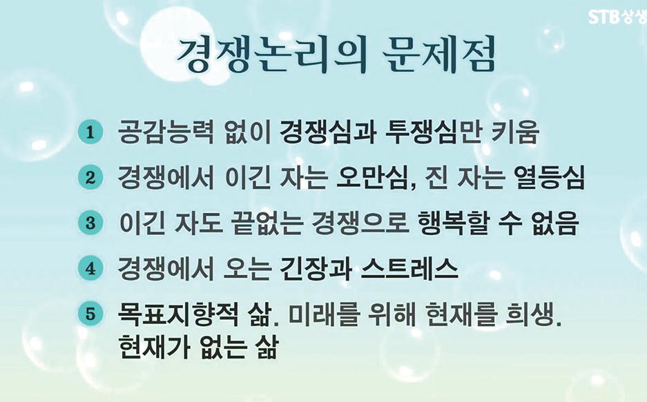 이렇게 끝없는 경쟁 속에서는 “1등을 하겠다, 뭔가를 이루겠다.”라는 목표를 세우고 그것을 달성하기 위해 사는 삶이 됩니다. 그럴 경우 현재라는 것은 늘 미래를 위한 수단이 되지요. #목표를 달성하면 행복해질 거라고 생각하지만, 그때까지는 행복을 느끼지 못하고, 정작 사람은 지금 이 현재 순간에 행복해야 하는데 현재는 행복하지 않은 거죠. 그래서 늘 불행한 의식을 갖게 됩니다.# 목표를 이루는 순간 잠깐은 기쁠 수 있어도 곧 다음 목표가 생기고, 다시 피곤하고 힘든 노력을 반복하게 됩니다.